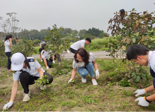到达大沙镇后,突击队立即开展以“弘扬雷锋精神,共建绿美广东”为主题的志愿活动。首先到黎雄村大塘面参与护绿养绿、绿道清洁工作,大家拾起工具、弯下身子,为新栽树苗清除杂草、稳固树根,同时清理白色垃圾。即使草杂虫多、汗流浃背,大家依旧干劲十足、齐心协力,为大沙镇的绿化贡献了一份绵薄之力。