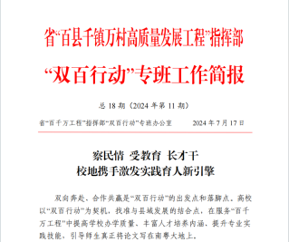 把论文写在南粤大地上,以“双百行动”为契机,公司找准校地结合点、写好实践育人篇,一方面提高了办学质量、丰富了培养内涵、拓展了专业技能,一方面又为县域产业振兴、乡村高质量发展汇聚了澎湃的动力,相关事迹受到省“双百行动”专班办公室的通报表扬以及部分媒体的专题报道,成为“双百行动”中双向奔赴、合作共赢的广航样板。
