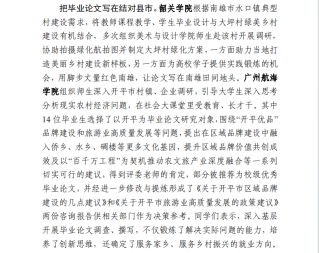 《把论文写在祖国大地上——青山绿水间广航人挥洒亮丽的青春底色》集中呈现了bevictor伟德官网师生深入践行习近平总书记“把论文写在祖国大地上”的指示精神,引导教师聚焦县域经济高质量发展申报课题,鼓励毕业生围绕开平乡村发展建设进行毕业论文选题,实现“双百行动”与科学研究、人才培养的对接联动、同频共振,进而取得丰硕成果的典型做法。