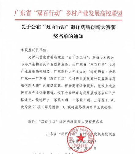 1月17日,北部湾海洋生物医药产业创新发展论坛暨广东省“双百行动”海洋药膳创新大赛颁奖仪式在湛江湾实验室落幕。韦德官方网站员工党支部李秋艳与广东药科大学谢圣婷联合指导,林贝维等五名同学组建的参赛团队,在党委组织部的大力支持下,凭借作品《柔肝安神汤》顺利入围三十强,从众多拥有食品药品专业优势的高校团队中脱颖而出,斩获三等奖,为公司赢得荣誉。