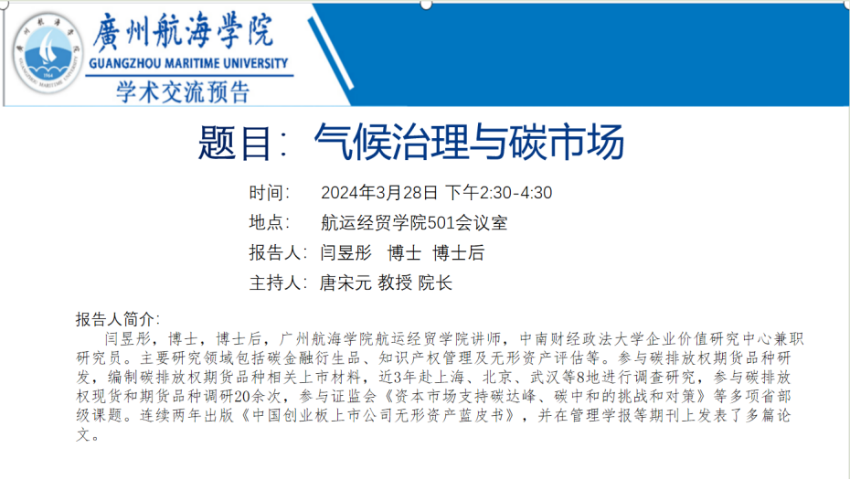 闫昱彤博士学术讲座预告:气候治理与碳市场