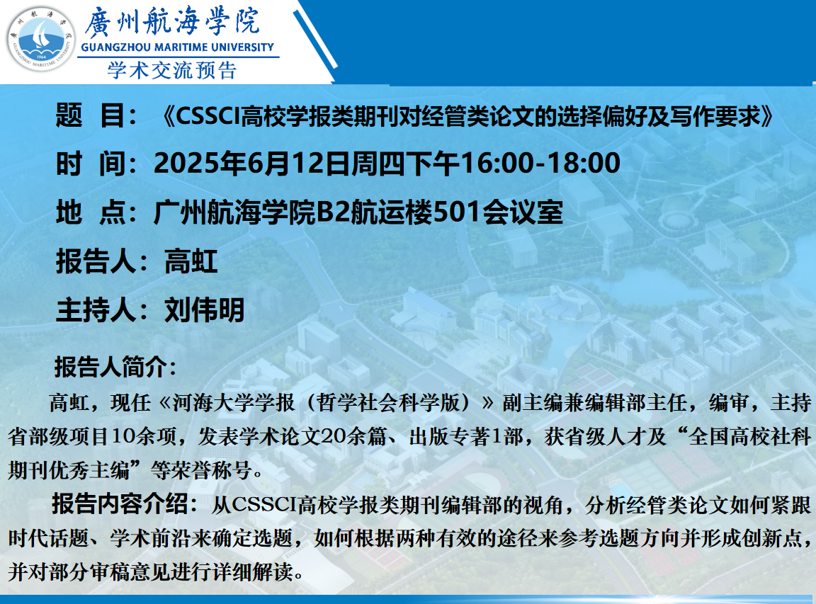 学术讲座预告:高虹《CSSCI高校学报类期刊对经管类论文的选择偏好及写作要求》