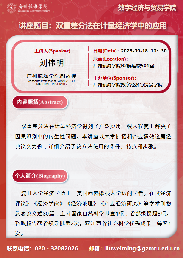 学术讲座预告:刘伟明《双重差分法在计量经济学中的应用》